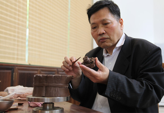 八十年代初开始自学紫砂陶艺,有幸得到沪上著名画家唐云先生的指教与激励此后又拜在唐云先生门下,成了老画家的关门弟子,也是他唯一一个陶艺方面的学生。许四海在唐云老师的指点下,触类旁通,视野大开,在从艺道路上达到了一个崭新的高度。唐云先生这样对许四海说:上海不缺科长,缺的是艺术家。1984年他为了自己一直痴迷的紫砂事业辞去公职,担任宜兴紫砂二厂副厂长,开始了在宜兴做紫砂壶的艰苦岁月。因为他知道,要成为一个出色的紫砂壶艺人,必须沉浸到这片由紫砂堆积起来的土地上,从此宜兴紫砂二厂多了个不寻常的上海人功夫不负有心人,许四海手制的紫砂雕塑“夏意”在1985年轻工部首届全国陶瓷作品评比中获得了高分并获得金奖。后来这件作品被美国亚洲艺术博物馆收藏自此他的每一件作品,都成为海内外紫砂壶具收藏家争购的对象。
